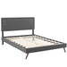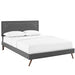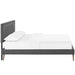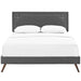 Accelerate your bedroom decor with the Ruthie Platform Bed. Made with a solid wood frame upholstered in polyester fabric, Ruthie features tapered wood legs, plastic foot glides, stylish headboard, and ten sturdy wood slats with a centered supporting bar and two support legs for enhanced stability. Due to the wooden slat support system, the use of a box spring is unnecessary. Ruthie supports memory foam mattresses such as our Aveline series. Perfect for mid-century modern, minimalist and contemporary bedrooms. Mattress not included. Assembly Required.