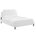 Bring vintage modern elegance and glam deco style to your master bedroom or guest bedroom with the Sienna Performance Velvet King Platform Bed. Featuring vertical tufting, a unique silhouette, and luxurious texture, the padded headboard of this king size bed offers supportive comfort while relaxing in bed. Covered in stain-resistant performance velvet, this upholstered bed is a sturdy mattress foundation for memory foam, innerspring, latex, and hybrid mattresses. Eliminating the need for a box spring, the MDF frame of this platform bed is complete with a wood slat support system crafted with poplar for lasting durability and support. This slatted bed frame rests on wood legs with gold sleeves and non-marking foot caps and includes a reinforced center beam with two support legs for enhanced stability. Assembly required. King Bed Weight Capacity: 800 lbs.