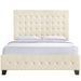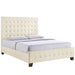 A prominent headboard casts its protective shadow upon this contemporary bedroom centerpiece. Skye is a queen size platform bed made with deep tufted buttons and a fine padded fabric upholstery that serve to soften the grandeur of the headboard. Skye requires assembly, and should be spot cleaned only. Headboard and footboard included. Queen size mattress not included. Skye’s slatted wood support system makes it so no box spring is needed.