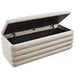 Elevate your home’s comfort and elegance with the Mezzo Performance Velvet Storage Ottoman. Padded with dense foam and wrapped in a luxe, stain-resistant performance velvet, this storage bench for the living room or bedroom is as practical as it is striking with its plush channel tufted detail. The stay-open hinge adds convenience, revealing a spacious storage area ideal for stowing linens, games, home accents, and more. Perfectly suited as a storage bench for the entryway or as a chic bed bench, Mezzo offers versatile use with its non-marking floor glides to protect your surfaces. Its robust design, coupled with the lush texture of performance velvet, makes it a centerpiece in any room. Arriving fully assembled, this bedroom bench saves you time and effort, allowing you to instantly enjoy its splendor and spacious utility. Weight Capacity: 617 lbs.