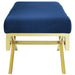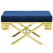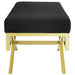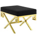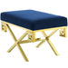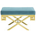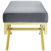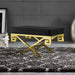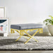 Embrace modern whimsy with Rove Performace Velvet Accent Bench. Brimming with energy and a sleek modern look, Rove features a polished gold stainless steel base with a Greek Key design, dense foam padding, and a soft stain-resistant performance velvet polyester upholstered top. A striking statement piece in the living room, bedroom or lounge area, Rove can support up to 331 pounds and comes with foot pads to help protect your flooring.