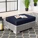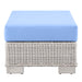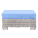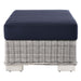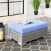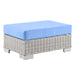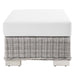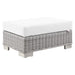 Enjoy fresh air and alfresco relaxation with the Conway Outdoor Patio Wicker Rattan Ottoman. Wrapped in UV-resistant light gray synthetic wicker rattan, this patio ottoman boasts organic texture and a neutral hue that brings a calming presence to your outdoor space. The frame of this outdoor ottoman is crafted with durable powder-coated aluminum and rests on L-shaped legs with plastic foot glides. A thick foam padded cushion covered with a removable, water-resistant polyester cover offers a comfortable seat and affixes securely to the ottoman with a cord tension attachment. Trending aesthetics and a classic design define this outdoor patio furniture collection making it a beautiful addition to any outdoor space including the backyard, patio, porch, balcony, or poolside. Assembly required. Patio Ottoman Weight Capacity: 300 lbs.