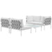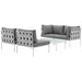 Engage life with Harmony Outdoor Patio Sectional Sofa Furniture Set. Enjoy casual conversation under the open sky with an all-weather waterproof furniture set that delivers an exceptional outdoor porch, patio, balcony or garden experience. An exceptional modern patio furniture set that exceeds expectations, this Harmony Outdoor Sectional set comes with long-lasting machine washable cushions, silk polyester seat back weave, square powder coated aluminum bases, tempered glass top tables, and non-marking foot caps. A sectional sofa that arranges according to the spontaneous needs of your guests, set your sights on open and inspired moments with the Harmony Outdoor Patio Collection.