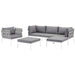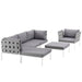 Engage life with Harmony Outdoor Patio Sectional Sofa Furniture Set. Enjoy casual conversation under the open sky with an all-weather waterproof furniture set that delivers an exceptional outdoor porch, patio, balcony or garden experience. An exceptional modern patio furniture set that exceeds expectations, this Harmony Outdoor Sectional set comes with long-lasting machine washable cushions, silk polyester seat back weave, square powder coated aluminum bases, tempered glass top tables, and non-marking foot caps. A sectional sofa that arranges according to the spontaneous needs of your guests, set your sights on open and inspired moments with the Harmony Outdoor Patio Collection.