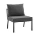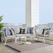 Refresh your outdoor decor with the Riverside Outdoor Patio Aluminum Sofa Set. This set includes the Riverside Outdoor Patio Armchair. Defined by a crisp, coastal style, this installment of the Riverside outdoor sectional sofa furniture collection features an open slatted back design, angled back legs, and plush 4" thick all-weather UV-resistant fabric cushions. Solidly constructed with a powder-coated aluminum frame, the Riverside outdoor sofa and armchair will enhance the look of your patio, backyard, balcony, porch, deck, or poolside area.