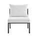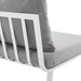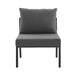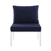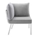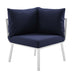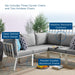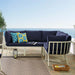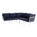Refresh your outdoor decor with the Riverside Outdoor Patio Aluminum 5 Piece Sectional. Defined by a crisp, coastal style, this installment of the Riverside outdoor sectional sofa furniture collection features an open slatted back design, angled back legs, and plush 4" thick all-weather UV-resistant fabric cushions. Solidly constructed with a powder-coated aluminum frame, the Riverside outdoor sectional will enhance the look of your patio, backyard, balcony, porch, deck, or poolside area.