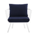 Refresh your outdoor decor with the Riverside Outdoor Patio Aluminum Sectional Set. This set includes Riverside Outdoor Patio Armchair and Table. Defined by a crisp, coastal style, this installment of the Riverside outdoor sectional sofa furniture collection features an open slatted back design, angled back legs, and plush 4" thick all-weather UV-resistant fabric cushions. Solidly constructed with a powder-coated aluminum frame, the Riverside outdoor sectional will enhance the look of your patio, backyard, balcony, porch, deck, or poolside area. Table constructed with a white powder-coated aluminum frame and smooth scratch-resistant cement top, durable, all-weather outdoor coffee table perfect for any outdoor get together.
