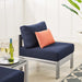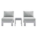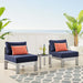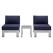 Enjoy your patio or backyard leisure time with the strong and durable Shore Aluminum 3 Piece Outdoor Patio Furniture Set. Made with anodized brushed aluminum frames and non-marking black plastic foot caps, Shore comes outfitted with resilient Sunbrella® fabric canvas cushions tested to last through all weather conditions. The Shore Outdoor Aluminum Outdoor Patio Set complements your casual gatherings with a look and functionality you can rely on. Set Includes: 2 Armless Chairs, 1 Side Table