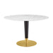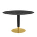 Gather family and friends for good food and conversation around the Zinque Dining Table. Bringing modern influence and mid-century inspiration to your dining space, this pedestal table reflects an organic shape. Perfect for entertaining or everyday dining, this dining table rests on a black and polished gold tapered base and features a 47" artificial marble tabletop with an easy-to-clean coating. Non-marking ring to protect flooring. Assembly required.