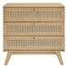 Introduce refreshing style to a primary or guest bedroom with the Soma 3-Drawer Dresser. Showcasing a beautiful rattan weave on the squared drawer fronts, this dresser brings organic aesthetics and modern functionality to a bedroom space. This dresser is crafted from durable MDF and particleboard with a natural wood grain finish. This bedroom dresser is complete with three full-extension glide drawers to offer ample storage space for bedroom essentials, clothes, linens, and more. Resting on splayed legs, Soma includes non-marking foot pads to protect flooring. Assembly required.