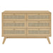 Introduce refreshing style to a primary or guest bedroom with the Soma 6-Drawer Dresser. Showcasing a beautiful rattan weave on the squared drawer fronts, this double dresser brings organic aesthetics and modern functionality to a bedroom space. This dresser is crafted from durable MDF and particleboard with a natural wood grain finish. This bedroom dresser is complete with six full-extension glide drawers to offer ample storage space for bedroom essentials, clothes, linens, and more. Resting on splayed legs, Soma includes non-marking foot pads to protect flooring. Assembly required.
