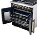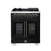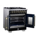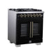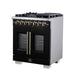 The Forno Capriasca 30 Inch French Door Dual Fuel Range in black with antique brass accessories brings professional-grade style and performance into your kitchen. Its signature French doors open outward to provide up to 12 inches of extra clearance, giving you easier access to the oven. The gas cooktop features five sealed dual-ring brass burners with a powerful 100,000 BTU total output, including a 20,000 BTU burner perfect for rapid boiling, high-heat searing, or gentle simmering of sauces and melted chocolate. Heavy-duty cast iron grates span the surface for maximum stability and smooth movement of cookware, while the recessed enamel cavity helps contain spills for effortless cleaning. Inside, the 4.32 cu. ft. electric oven delivers 6,300 watts of cooking power with true convection technology, ensuring fast, precise, and consistent results. A speckled blue enamel interior adds durability and easy maintenance, while the triple-layer glass oven door window provides clear visibility without sacrificing heat retention. The Capriasca also includes premium accessories: three stainless steel telescopic oven racks, an LP conversion kit, wok ring, reversible griddle, rotisserie kit with skewers, and an air fry basket with rack and drip pan.
