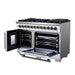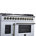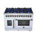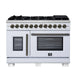 The Forno Capriasca 48 Inch French Door Dual Fuel Range in white with antique brass accents combines professional styling with powerful performance for the home kitchen. Its French door design provides up to 12 inches of extra clearance, making it easier to load and access the oven. The cooktop is equipped with eight sealed dual-ring brass burners delivering a total of 160,000 BTU, offering precise control for everything from high-heat searing to gentle simmering. Heavy-duty continuous cast iron grates keep cookware stable and allow smooth movement across the recessed enamel cooking surface, which helps contain spills for quick cleanup. The double electric ovens provide a combined 6.58 cu. ft. capacity with 9,700 watts of cooking power. Both interiors are finished in durable speckled blue enamel with triple-layer glass oven doors, while the right oven features a true convection fan for fast and even results. Premium accessories are included: six stainless steel telescopic oven racks, an LP conversion kit, wok ring, reversible grill/griddle, rotisserie kit with skewers, and an air fry basket with rack and drip pan. Zinc-coated metal knobs with bezel rings add a refined touch and long-lasting durability.