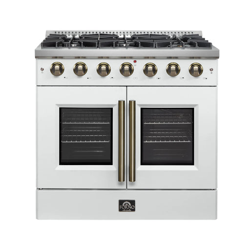 FornoThe Forno Galiano 36" French Door Gas Range brings timeless style to your home with a crisp white finish and antique brass knobs and handles. Six s...