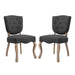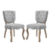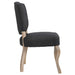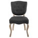 Usher forth a harmonious dining environment with the Array Vintage French Dining Side Chair. Four saber-shaped weathered wood legs develop a sculptured silhouette, while the shield back with button tufting displays hints of opulence. Complete with a generously padded seat, and soft polyester upholstery, Array comes with non-marking foot caps to preserve floor integrity, supports up to 331 pounds, and does not require assembly.