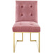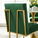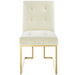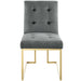 Maximize your dining room decor with Privy. A glam deco dining chair, Privy features soft and stain-resistant performance velvet polyester upholstery for a streamlined modern look. This modern dining chair rests atop a sleek gold stainless steel geometric base that will elevate your dining experience. No assembly required. Chair Weight Capacity: 331 lbs.