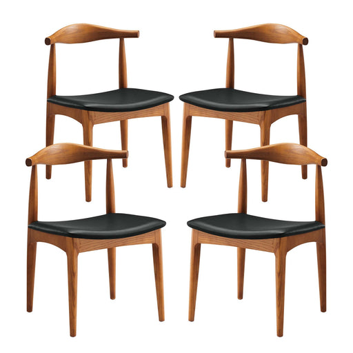 ModwayThe Tracy Dining Side Chair features a mid-century slightly curved back made of wood and a foam padded seat upholstered in black leatherette.