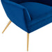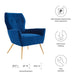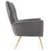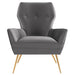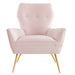 Heighten the elegance in your living room with the empowering Renata Button Tufted Performance Velvet Armchair. This retro glam armchair boasts an intriguing silhouette enhanced with a three-button tufted backrest complemented by gently spayed gold stainless steel legs. A harmonizing presence in mid-century modern, contemporary, or eclectic decors, this velvet armchair is a precious accent chair in the bedroom, office, or entryway. Renata is equipped with stain-resistant performance velvet fabric and non-marking foot glides to protect your floors. This velvet armchair provides comfort with a webbed support system and dense foam padding. Weight Capacity: 331 lbs.