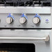 • Bright blue LED indicator lights above oven knobs add a professional touch