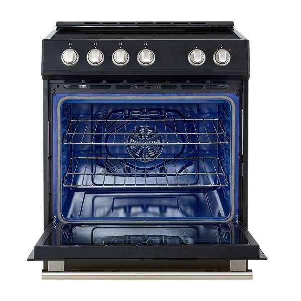 The FORNO Leonardo Espresso 30-Inch Black Induction Range elevates your cooking experience with a perfect blend of style, functionality, and reliability. Featuring a sophisticated black finish, this unit includes knobs and handles in both antique brass and stainless steel, allowing you to customize your kitchen decor. Experience the efficiency of our powerful 8,100-watt induction elements, designed to deliver optimal cooking performance. The 5 cu.ft. convection oven boasts a high-performance convection fan and a broil and bake output of 3,500 watts. With two oven racks at your disposal, explore endless culinary possibilities with ease. The speckled blue enamel interior guarantees consistent heat absorption and retention, ensuring every dish is cooked to perfection. Effortless operation is ensured by friction-resistant hinges, while the hidden bake element prevents spills, simplifying maintenance. Skip the high price tags without sacrificing quality and performance. Lower the cost of living with Forno.