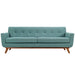 Gently sloping curves and large dual cushions create a favorite lounging spot. Whether plopping down after a long day at work, settling in with coffee and brunch, or entering a spirited discussion with friends, the Engage sofa is a welcome presence in your home. Seven tufted buttons create eye-catching appeal, adding depth that brings your sitting décor to center stage. Four cherry color rubberwood legs and frame supply a solid base to the comfortable upholstered material.