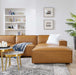 Create your custom living room and lounge area with the Restore Vegan Leather 7-Piece Sectional Sofa. The Restore Sectional Sofa appeals to minimalist elegance with a crisp design and broad lines accented with French piping details and vegan leather upholstery. Dense foam padding and a pocket coil spring system in the cushions offer a luxe seating experience for your living room and lounge. The Restore Living Room Sectional Sofa is solidly constructed from plywood and wood with non-marking foot caps to protect flooring and connectors between modular pieces. Each Piece Weight Capacity: 440 lbs.