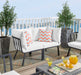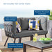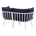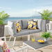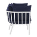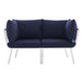 Refresh your outdoor decor with the Riverside Outdoor Patio Aluminum Loveseat. Defined by a crisp, coastal style, this installment of the Riverside outdoor sectional sofa furniture collection features an open slatted back design, angled back legs, and plush 4" thick all-weather UV-resistant fabric cushions. Solidly constructed with a powder-coated aluminum frame, the Riverside outdoor loveseat will enhance the look of your patio, backyard, balcony, porch, deck, or poolside area. Includes foot caps. Seat Weight Capacity: 300 lbs