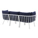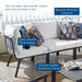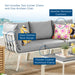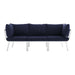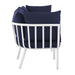 Refresh your outdoor decor with the Riverside Outdoor Patio Aluminum Sofa. Defined by a crisp, coastal style, this installment of the Riverside outdoor sectional sofa furniture collection features an open slatted back design, angled back legs, and plush 4" thick all-weather UV-resistant fabric cushions. Solidly constructed with a powder-coated aluminum frame, the Riverside outdoor sofa will enhance the look of your patio, backyard, balcony, porch, deck, or poolside area. Includes foot caps. Seat Weight Capacity: 300 lbs