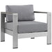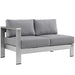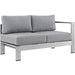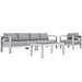Enjoy your patio or backyard leisure time with the strong and durable Shore Outdoor Patio Collection. Made of anodized brushed aluminum frames and non-marking black plastic foot caps, Shore Outdoor Sectional Sofa pieces come outfitted with resilient fabric canvas tested to last through all weather conditions. The Shore Outdoor Patio Sectional Furniture Set complements casual gatherings with a chic look and ready versatility you can rely on.