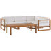 Refresh your outdoor décor with the Upland Teak Wood Outdoor Patio Furniture Collection. Boldly designed with eye-catching appeal, the Upland Outdoor Patio Teak Wood 5-Piece Sectional Sofa Set is made of solid teak wood and a solidly build construction. The perfect choice for balconies, backyards, patios, gazebos, poolside or garden spaces, this outdoor patio sectional sofa set creates a custom seating experience with its modular design. Known for its ability to withstand extreme weather conditions, teak is the wood selection of choice for long-lasting outdoor furnishings. Rich in modern style, the Upland Outdoor Patio Sectional Sofa Collection opens up a variety of configurations to suit any gathering. Assembly required. Set Includes: Coffee Table, Left-Arm Chair, Right-Arm Chair, Armless Chair, Corner Chair