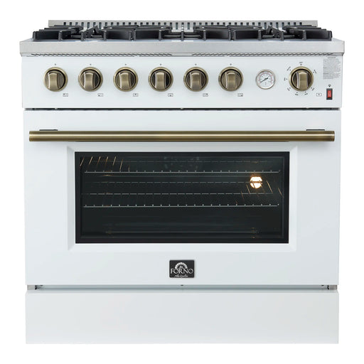 View full detailsForno Marco 36-Inch Gas Range with 6 Burners and 5.36 Cu.Ft. Convection Oven in White with Antique Brass Trim (FFSGS6277-36WHT)