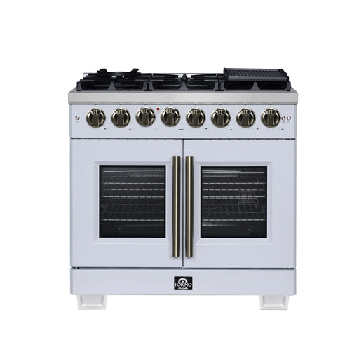 View full detailsForno Capriasca 36-Inch Freestanding French Door Dual Fuel Range in White with Antique Brass Handle (FFSGS6387-36WHT)