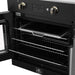 A bold black finish paired with antique brass knobs and handles creates a striking contrast, adding timeless elegance to any kitchen.