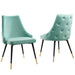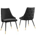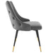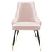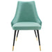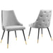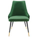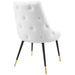 Revitalize dining decor or your living space with the Adorn Tufted Performance Velvet Dining Side Chair. Classic button tufting along the chair's exterior and graceful sweeping lines blend seamlessly into the lush comfort of this dining chair. With soft stain-resistant performance velvet upholstery, this accent chair offers a comfortable place to rest with dense foam padding. Sitting on four black tapered legs with gold foot sleeves, Adorn's versatile vintage modern style and glam deco charm makes this side chair ideally suited for a variety of rooms. Place this velvet chair around the dining table, or use it as an accent chair in the living room, bedroom or entryway, or update your home office seating with use as a cute desk chair. This modern dining chair supports up to 300 lbs. and is complete with non-marking foot caps to protect your flooring. No assembly required.
