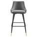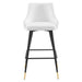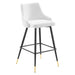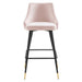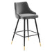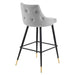 Revitalize dining room or kitchen decor with the Adorn Performance Velvet Bar Stool. Classic button tufting along the stool's exterior and graceful sweeping lines blend seamlessly into the lush comfort of this bar stool. Covered with soft stain-resistant performance velvet, this upholstered bar stool offers a comfortable place to dine with a dense foam padded seat. Sitting on four black tapered legs with gold foot sleeves, Adorn's vintage modern style and glam deco charm makes this bar stool ideally suited for a bar table or kitchen counter, or even as an accompaniment to a standing desk in the home office. This modern dining bar stool supports up to 300 lbs. and is complete with non-marking foot caps to protect your flooring. No assembly required.