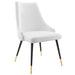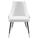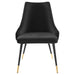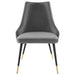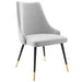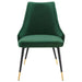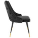 Revitalize dining decor or your living space with the Adorn Tufted Performance Velvet Dining Side Chair. Classic button tufting along the chair's exterior and graceful sweeping lines blend seamlessly into the lush comfort of this dining chair. With soft stain-resistant performance velvet upholstery, this accent chair offers a comfortable place to rest with dense foam padding. Sitting on four black tapered legs with gold foot sleeves, Adorn's versatile vintage modern style and glam deco charm makes this side chair ideally suited for a variety of rooms. Place this velvet chair around the dining table, or use it as an accent chair in the living room, bedroom or entryway, or update your home office seating with use as a cute desk chair. This modern dining chair supports up to 300 lbs. and is complete with non-marking foot caps to protect your flooring. No assembly required.