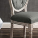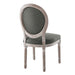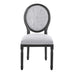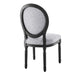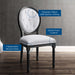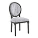 Revel in the whispered opulence of the Arise Dining Side Chair. Featuring a fluted wood frame, button tufted diamond trim, elegant welting, dense foam padding, an upholstered fabric seat, this oval back dining or accent chair elegantly blends old world charm with modern intrigue. Designed with a vintage French look and an undeniable appeal, Arise supports up to 331 pounds and comes with foot pads to preserve flooring. Comes fully assembled.