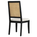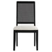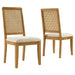 Discover the Arlo Dining Chair Set of Two, a stylish union of durability and design. These wood dining chairs boast expertly crafted faux rattan cane backrests, providing a breezy complement to the solid wood frames. Comfort is key with seats that feature dense foam padding enveloped in heathered weave fabric. This set of 2 dining chairs includes non-marking foot glides protect floors from scuffs and scratches. The Arlo chairs seamlessly merge the rustic allure of farmhouse chairs with the sleekness of modern dining room furniture, making them ideal for use as both dining and accent chairs. Assembly required. Weight Capacity: 551 lbs.