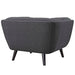 Generously update your decor with Bestow. Uniquely designed with a striking broad profile, Bestow comes finely upholstered in polyester fabric with dense foam padding and elegant button tufting. Sturdily positioned on splayed and tapered black finish wood legs with non-marking foot caps, Bestow boasts a bountiful living room seating design brimming with possibilities. With ample seat depth and overscaled frame, invite all your guests to sit comfortably in this 12" high back and arm rest collection perfect for mid-century, modern farmhouse or contemporary decors.