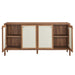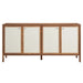 Elevate your decor with the modern Capri Sideboard, a large and spacious cabinet that opens up to versatile storage options. This piece effortlessly transitions from a sideboard storage cabinet to an elegant credenza, crafted with durable particleboard and MDF, finished with a wood grain laminate for a touch of organic aesthetics. Its linen-textured doors, equipped with soft-close hinges, reveal two storage spaces for all your needs. Ideal as a storage cabinet in your entryway or hallway, it also functions seamlessly as a centerpiece of living room furniture or as a buffet cabinet. With non-marking glides to protect your flooring, this credenza cabinet is a quintessential addition to any living space or dining room, designed for easy assembly and to provide a sophisticated solution for keeping your home organized and stylish. Tabletop Weight Capacity: 200 lbs.; Each Shelf Weight Capacity: 44 lbs. Please Note: When placing the TV directly on the unit, we recommend anchoring it in place.
