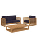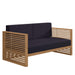 Enjoy warm weather and spirited conversation with the Carlsbad Teak Wood Outdoor Patio Furniture Set. A bold statement on the porch, in your backyard, or poolside, this patio set abounds in contemporary style with a slatted, clean-lined design. Ideal for al fresco entertaining or relaxing by the pool, the Carlsbad Outdoor Patio Furniture Collection is crafted with durable Premium Grade A teak wood and complete with comfortable cushions covered in machine washable sun, stain, water, and fade resistant Sunproof® fabric covers. Includes non-marking plastic foot glides. Patio Set Includes: Loveseat, Armchair, Coffee Table