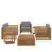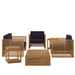 Enjoy warm weather and spirited conversation with the Carlsbad Teak Wood Outdoor Patio Furniture Set. A bold statement on the porch, in your backyard, or poolside, this patio set abounds in contemporary style with a slatted, clean-lined design. Ideal for al fresco entertaining or relaxing by the pool, the Carlsbad Outdoor Patio Furniture Collection is crafted with durable Premium Grade A teak wood and complete with comfortable cushions covered in machine washable sun, stain, water, and fade resistant Sunproof® fabric covers. Includes non-marking plastic foot glides. Patio Set Includes: 1 Loveseat, 2 Armchairs, 1 Coffee Table, 2 Side Tables