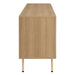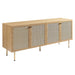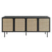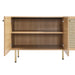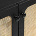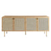 Refresh your living space with the textured detail of the Chaucer Sideboard. Featuring beautiful rattan weaving on the doors, this credenza updates a living room, entryway, dining room, hallway or lounge area. A spacious shelving area hidden behind the hinged doors offers ample storage space for linens, home décor, china, silverware, barware, and more. Resting on sleek legs with adjustable feet for added stability, this buffet table is durably crafted with particleboard and wood grain laminate to bring natural organic aesthetics to your décor. Assembly required. Shelf Weight Capacity: 44 lbs. Please Note: When placing the TV directly on the unit, we recommend anchoring it in place.
