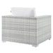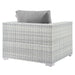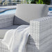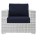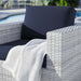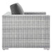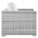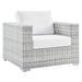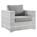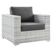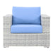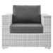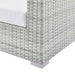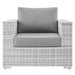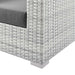 Gather stages of sensitivity with the Convene Outdoor Sectional series. Made with a synthetic rattan weave and a powder-coated aluminum frame, Convene is a versatile patio armchair from an outdoor collection that shifts and combines according to the spontaneous needs of the moment. Outfitted with all-weather fabric cushions, the Convene Armchair leaves a positive impression on friends and family while enhancing your patio, backyard, or poolside retreat with palpable distinction.