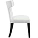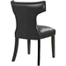 Transform your dining décor with the broadly designed Curve Dining Side Chair. Sweeping lines complement a minimalist shape for a chic look studded with nailhead trim. Curve comes generously padded with dense foam covered in vinyl, non-marking foot caps, and delivers just the right touch of finesse with tapered wood legs. Sporting an hourglass shape, Curve works well in a variety of dining room arrangements.