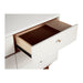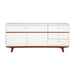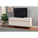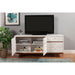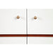The Dakota wood TV Console combines function with contemporary styling. Mahogany solids and veneers are beautifully finished in White with Acorn trim and base, accented with gold hardware. 2 doors with interior shelves plus 3 drawers provide extensive storage. The piece is finished with a felt-lined top drawer, wire management, and is shipped fully assembled. Coordinates with other items from the Alpine Furniture Dakota collection.