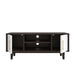 Encourage mid-century modern design in your living space with the Daxton 43" TV Stand. Sleek lines, splayed legs, gold metal hardware, and contrasting tones create a striking piece for your living room, bedroom, lounge room, or home office. Made with particleboard, MDF, and beautiful wood grain paper lamination, Daxton features ample storage space with an adjustable center shelf and two storage areas behind solid white doors. Cable management holes make this entertainment console ideal for keeping all your media essentials organized. A versatile addition, this television stand can accommodate TV's up to 46" and also serves as a display stand for home accessories, decor, and more. Includes non-marking foot pads.