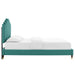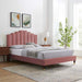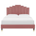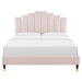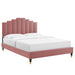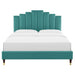 Refresh your master bedroom or guest suite with the luxurious style of the Elise Performance Velvet King Platform Bed. Abounding in glam deco style, the king headboard of this platform bed features a modern twist on classic channel tufting with velvety panels ascending upwards in an arching design. Resting atop wood legs with gold metal sleeves, this upholstered bed is covered in soft, stain-resistant performance velvet and dense foam padding. This king size bed is a sturdy mattress foundation for memory foam, innerspring, latex, and hybrid mattresses. With supporting legs and a reinforced center beam, this upholstered bed is complete with a poplar wood slat support system that offers lasting stability. Assembly required. King Bed Weight Capacity: 800 lbs.