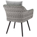 Gather family and friends to indulge in good weather and a premium lounge experience with the Endeavor Outdoor Patio Collection. Sporting a stylish contemporary modern look, Endeavor Patio Arm Chair features waterproof, black powder-coated aluminum legs and non-marking foot caps. A designer gray-on-gray tone synthetic rattan weave perfect for upgrading a variety of balcony, garden, backyard, and patio decors make Endeavor Outdoor Arm Chair a vital outdoor decor piece. The spacious profile of this wicker rattan arm chair and all-weather cushions offer long-lasting comfort when relaxing or entertaining.