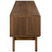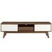 Elevate your entertainment decor with the Envision 59” TV Stand. Featuring an elegant linear silhouette, Envision comes designed with two sliding white doors for discreet storage space, height adjustable shelves on either side, a full-extension center glide drawer with cable management, center open storage for your game system, DVD or Blu-ray player, and walnut grain laminate over durable fiberboard for reliable support. Supported by flared and tapered legs, update your living room decor while keeping your visual space clean with this versatile TV stand. Accommodates flat screen TVs up to 65 inches.